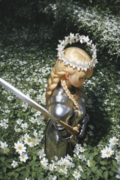 masterpiece, best quality, (sideways glance:1.2), profile, from above, woman, blue gray eyes, silver armor, blonde hair, silver and gold metal, braided hair, flower crown, gold jewelry, holding sword, head turned to the side,floral background, white theme, surreal, leaf, plant, dappled sunlight, shade,2dReal, ((photo background, film grain)), dark, blurry background, depth of field, impressionism,