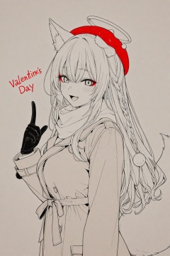 masterpiece, high detail, best quality, long_hair, monochrome, cue!, pom_pom_\(clothes\), beret, lips, blue_eyes, yomine_miharu, short_hair, earrings, bow, fox_girl, fox_tail, scarf, sidelocks, animal_ear_fluff, closed_mouth, two-tone_scarf, index_finger_raised, hair_between_eyes, coat, upper_body, yellow_scarf, bangs, white_background, large_breasts, spot_color, long_sleeves, black_gloves, halo, smile, greyscale, braid, breasts, pointing, brown_hair, skin_fang, blush, fox_ears, solo, makeup, red_eyeshadow, open_mouth, looking_at_viewer, eyeshadow, from_side, english_text, animal_ears, hat, jewelry, 1girl, red_hat, hair_ornament, shop, tail, shirako_miso, lineart, pom_pom_hair_ornament, gloves, brown_coat, valentine, official_art, fang, simple_background