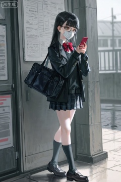 Delicate eyes,delicate face,1girl, mouth mask, phone, long hair, mask, cellphone, skirt, black hair, smartphone, holding phone, school uniform, solo, bangs, brown eyes, shoes, bag, holding, jacket, bow, blunt bangs, looking at phone, pleated skirt, socks, surgical mask, bowtie, full body, black jacket, loafers, plaid, school bag,  A girl in a black coat and glasses stands outdoors. She holds a cell phone. Her hairstyle is straight, parted to one side. The background is dimly lit, providing contrast to her dark attire.