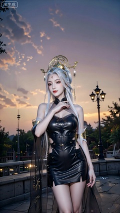 在黄昏的户外场景中,一位白发女性站立着,头上的金色凤簪,额头上的印记,她身着一件黑色的皮质抹胸短裙,裙子带有交叉系带的镂空设计,手腕佩戴着金属质感的宽手镯,手指上戴着戒指。背景是橙紫色渐变的天空,远处有树木、路灯以及隐约可见的建筑,营造出时尚且浪漫的氛围。