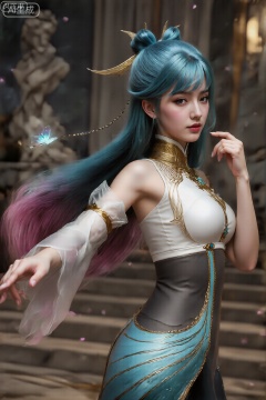图片标签该图显示了一个穿着精美服装的人,可能是角色扮演或主题活动。该人的蓝色头发长长,充满活力的蓝色头发,在高发bun中,有些链流下来。服装具有白色,无袖上衣,前部和侧面有复杂的金色细节。顶部具有高领和合适的设计。服装的下部是一条合身的蓝绿色裙子,带有金线条和闪烁的质地,使其具有未来派或幻想的外观。该人正优雅地摆姿势,一只手臂向外伸出,另一只手臂弯曲在肘部,手靠近脸。背景似乎是一个室内环境,楼梯,模糊的雕像和一些柔和的照明,暗示了装饰性或礼仪环境。空气中还有一些粉红色的花瓣状颗粒,为现场增添了异想天开的感觉。