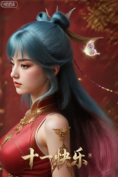 在充满国风韵味的红色背景和秋天金色的,一位美女身穿红色旗袍,,,还有用富有国风特色的书法字体书写的“十一快乐”文字作为装饰,整体营造出国风主题风格,