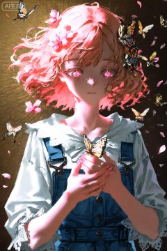 a mystical and enchanting atmosphere. The color palette is rich and vibrant, with deep blues and purples contrasting against the warm tones of the character's clothing and the surrounding flora. The use of light and shadow adds depth and dimension to the scene, highlighting the ethereal quality of the butterflies and the delicate petals floating around.