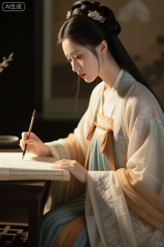 精细刻画面部的细微之处,光影对比柔和,通过巧妙的光影突出主体,立体感强,颜色光线色彩变化强烈,打光手法熟练。一位穿着精致的古风小姐微微侧头坐着拿笔书写长书卷,服饰精致大气,古风衣服层层叠叠,人物在图中占比约三分之二,微微侧面俯视角度,贴近脸部展开绘画,脸部在图中占比极高且精致