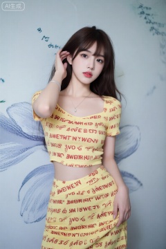 这是一张现代风格的高分辨率肖像照片,以一位年轻女子为特色。她穿着一件黄色的露脐连衣裙,上面印着红色的英文字母。她的头发松散地垂在肩上,一只手放在耳朵附近,另一只手垂在身体两侧。她平静地直视着镜头。她看起来二三十岁,身材苗条,皮肤白皙。她棕色的头发自由地垂在背上,没有刘海。背景现在是一堵柔和的淡蓝色墙壁,上面装饰着抽象的白线艺术和微妙的花卉图案,营造出清新通风的氛围,与她的服装和表情相得益彰。,