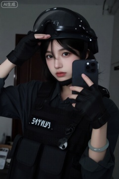 一位年轻女性扮演战术或军事角色的特写镜头.,以下是细节的分解:她有一头黑发,在黑色战术头盔下部分可见戴着遮阳帽. 她的妆容很淡雅,重点突出她的眼睛和嘴唇. 她穿着一件带小袋的黑色战术背心,黑色手套,穿着深色长袖衬衫或夹克. 她右手腕上戴着一只玉色的手镯. 她的表情有些严肃和紧张.服装和头盔高度暗示了军事或SWAT风格的装备,强调战术外观. 服装对细节的关注显而易见.背景昏暗,看起来像是一个室内空间,可能是卧室或走廊. 可以看到镜面反射,显示房间的局部视图. 背景中隐约可见一扇门,可以看到部分壁橱或衣柜. 整体氛围黑暗而忧郁.女人拿着智能手机,展示了她穿着同一件服装的自拍照. 这张自拍照似乎是从稍微不同的角度拍摄的.图像传达出强烈的美感,融合了角色扮演元素,时尚,以及军事或战术主题. 黑暗而忧郁的色调,