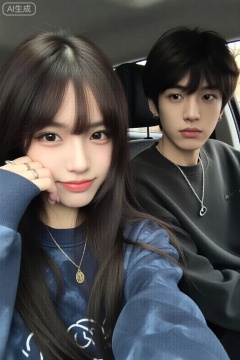 两个年轻人坐在车里的特写。这个人主要是焦点,似乎是女性。她有一头深棕色的长发,刘海部分遮住了额头。她的头发梳直了,垂到胸前。她穿着一件深蓝色或靛蓝色的运动衫,上面有扎染或大理石花纹。这件运动衫是长袖的,看起来很柔软。她戴着一条精致的金项链和一个小吊坠。她的妆容很明显,她似乎有浅色的皮肤和深色的眉毛。她用手触摸脸颊附近的脸,戴着戒指。这个人有点失焦,看起来是男性。他有一头整洁的深棕色短发。他穿着一件深灰色或炭灰色的毛衣或夹克,胸前似乎有一个小标志或文字。他的左耳上戴着一个耳环。他的表情有些严肃,似乎在看画面的左侧。他被前景中的女人遮住了一部分。他们坐在一辆汽车的前排座位上。车内很黑