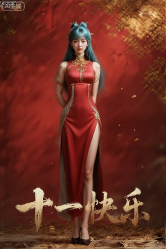在充满国风韵味的红色背景和秋天金色的,一位美女身穿红色旗袍,,,还有用富有国风特色的书法字体书写的“十一快乐”文字作为装饰,整体营造出国风主题风格。,王冬儿,蓝色头发