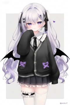 1girl, sleeves past wrists, solo, twintails, necktie, wings, frills, purple eyes, skirt, long hair, pleated skirt, x hair ornament, hair ornament, black necktie, sleeves past fingers, shirt, thighhighs, white shirt, white thighhighs, looking at viewer, hairclip, black skirt, low wings, grey background, heart o-ring, long sleeves, collared shirt, frilled shirt, hair ribbon, closed mouth, cardigan, black wings, center frills, frilled shirt collar, frilled thighhighs, demon wings, smile, black ribbon, ribbon, blush, ear piercing, grey hair, very long hair, black cardigan, thigh strap, two-tone background, piercing, earrings, simple background, jewelry, jacket, white background, bat wings, black jacket, heart, standing, school uniform, braid, hair between eyes, cowboy shot, hair intakes, purple hair, hair bow, bow, hand up, twitter username, puffy sleeves, dress shirt, white border