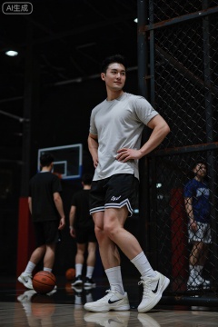 型男站在社区球场的边缘,双手叉腰望向场内,眼神里带着几分跃跃欲试的期待,嘴角噙着浅浅的笑意。他穿着浅灰色宽松篮球T恤,袖子随意卷到小臂,下身是黑色运动短裤,裤脚边缘有细密的抽绳,脚上的篮球鞋款式利落,鞋型流畅,鞋侧的品牌标志低调却清晰,鞋带系得整齐,鞋帮贴合脚踝。他右脚脚尖轻点地面,左腿微微弯曲,姿态放松中透着随时准备上场的活力,T恤下摆被风掀起一角,露出腰间紧实的线条,与脚下的篮球鞋形成自然的运动搭配。