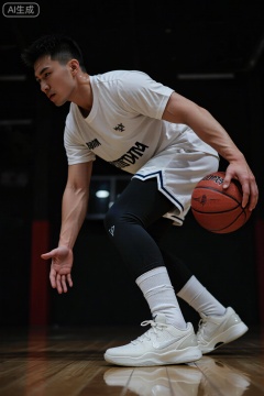 型男在球场上完成一次急停变向,身体向左侧倾斜,右手护球,左手张开保持平衡,眼神警惕地观察防守,脸上因发力而线条紧绷,汗珠顺着下颌线滑落。他穿着白色篮球服,胸前的队徽清晰可见,短袖被肌肉撑起,显露出手臂的线条;下身是白色短裤,裤腿宽松,内侧的黑色紧身裤若隐若现,裤脚堆在篮球鞋的鞋帮上。篮球鞋设计简洁,鞋头圆润,鞋底纹路深刻,鞋跟处的支撑结构隐约可见,与整体造型形成利落的运动风格。变向的瞬间,短裤向一侧扬起,紧身裤与腿部的贴合感凸显,球鞋与地面摩擦产生的细微声响仿佛能透过画面传来。