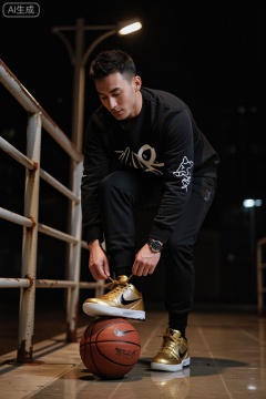 男性写真,主体:男性系鞋带时姿态复古优雅,一脚轻踩篮球,神情沉静怀旧;黑色卫衣带复古运动符号,Nike Zoom Kobe 4 Gold的金色鞋身在怀旧氛围中,与脚下篮球的复古棕调形成“现代战靴× 经典运动” 的碰撞,科比战靴设计更显传奇感。场景:中景,背景为年代感露天球场(生锈栏杆、磨损地面),夜晚暖黄灯光营造老派氛围;前景水泥地面与人物、球鞋、篮球形成“粗犷× 精致” 对比。光线:柔和散光灯(模拟老式路灯),光线均匀洒下,Nike Zoom Kobe 4 Gold的金色呈现复古金属哑光质感,篮球的棕调也显露出岁月感纹理,卫衣复古印花与肌肤质感柔和。渲染:复古胶片质感,增加颗粒感,强调卫衣复古纹理、肌肤怀旧色调、球鞋金色哑光感与篮球复古纹理。色彩:低饱和暖棕调,卫衣、夜色融复古黄棕,Nike Zoom Kobe 4 Gold的金色因低饱和更沉稳,与篮球棕调呼应,构建怀旧运动色调。构图:经典居中构图,人物、球鞋、篮球构成稳定三角,踩球动作增添动态,金色球鞋为视觉锚点。镜头视角:平视怀旧视角,增强纪实感与情怀代入感。滤镜:「复古博弈」滤镜,降低饱和度,增加黄棕调,模拟老照片质感,保留金色球鞋亮点。摄影参数:尼康Z 9,NIKKOR Z 24-70mm F2.8 S,快门1/320s,光圈f/2.8,焦段35mm,ISO 1200。