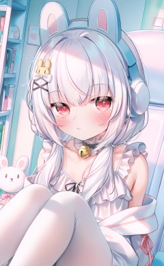 masterpiece,highres,absurdres,newest,best quality,loli,petite,high quality,chromatic_aberration,//,1girl,solo,headphones,animal_ear_headphones,white_pantyhose,fake_animal_ears,rabbit_hair_ornament,animal_ears,red_eyes,long_hair,knees_up,twintails,sitting,low_twintails,looking_at_viewer,frills,white_hair,pantyhose,closed_mouth,swivel_chair,hair_ornament,blush,bell,hair_bow,x_hair_ornament,bow,indoors,rabbit_ears,bag,neck_bell,choker,sleeveless,on_chair,off_shoulder,white_dress,black_choker,hairclip,jingle_bell,collarbone,bare_shoulders,chair,white_bow,office_chair,hair_over_shoulder,dress,bookshelf,hair_between_eyes,box,stuffed_rabbit,frilled_choker,frilled_dress,sleeveless_dress,feet_out_of_frame,book,stuffed_toy,white_camisole,collar,//,<lora:guizhencao2——【noob】hans-000008:1>,