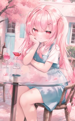 masterpiece,highres,absurdres,newest,best quality,loli,petite,high quality,chromatic_aberration,//,1girl, pink_hair, solo, sitting, long_hair, hair_ornament, cup, looking_at_viewer, white_shirt, drinking_glass, shirt, table, smile, chair, petals, cocktail_glass, twintails, short_sleeves, hairclip, closed_mouth, collared_shirt, cherry, outdoors, red_eyes, dress, window, blush, bottle, hair_between_eyes, feet_out_of_frame, flower, very_long_hair, day, on_chair, tree, head_rest, cherry_blossoms, food, wine_glass, sleeveless_dress, drink, wine_bottle, fruit, sleeveless, pink_flower, hand_up, blue_dress, pink_eyes, x_hair_ornament, hand_on_own_face, pinafore_dress//,<lora:guizhencao2——【noob】hans-000008:1>,