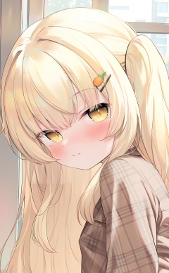 masterpiece,highres,absurdres,newest,best quality,loli,petite,high quality,chromatic_aberration,//,1girl,food-themed_hair_ornament,hair_ornament,blush,solo,long_hair,window,shirt,looking_at_viewer,yellow_eyes,brown_shirt,hairclip,indoors,one_side_up,closed_mouth,blonde_hair,looking_to_the_side,plaid,plaid_shirt,portrait,upper_body,//,<lora:guizhencao2——【noob】hans-000008:1>,
