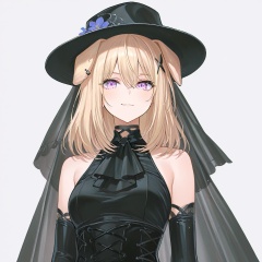 masterpiece, best quality,solo,(white background:1.2),simple background,1girl,looking at viewer, Misumi Uika,blonde hair bangs,purple eyes,smile,medium hair,hair between eyes,gloves,hat,dress, animal ears, bare shoulders, flower, boots, black gloves,black footwear, black dress, high heels, black headwear,hair ornament,sleeveless,elbow gloves,dog ears,sleeveless dress<lora:舟uika-ill01e:0.8>