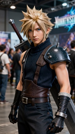 《最终幻想7:重制版》里的克劳德·斯特莱夫(Cloud Strife),cosplay,临场感十足,真实人物摄影,漫展现场。
