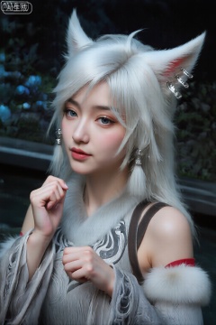 该图像的特点是一个长长,直,白发的人,落在肩膀上。他们的耳朵大,带有粉红色的内线,类似于动物耳朵,并将三个银色发夹放在头部的右侧。该人戴着精美的耳环,这些耳环是银色的。他们的眼睛是浅蓝色,嘴唇是柔软的粉红色阴影。该人穿着无袖的衣服,带有复杂的漩涡状图案,灰色和白色的阴影。肩膀和袖子的末端用白色的皮毛修剪。背景包括模糊的绿色植物和一些蓝色和白色的灯光,暗示了户外夜间环境。总体印象是动漫或幻想环境中的角色。