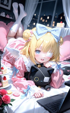 masterpiece,absurdres,best quality,high quality,chromatic_aberration,night,darkness,black theme,photorealistic,high contrast,high saturation,loli,loli,loli,//, 1girl,frilled pillow,macaron,rose,sleeves past wrists,bell,eyepatch,food,bow,cake,blue eyes,hair bow,frills,sleeves past fingers,blue bow,jingle bell,pillow,:d,red rose,hair bun,long sleeves,puffy sleeves,blonde hair,flower,socks,white wings,solo,no shoes,smile,laptop,on stomach,red flower,strawberry,double bun,hair bell,stuffed animal,computer,soles,swirl lollipop,lying,pink rose,heart-shaped pillow,medical eyepatch,stuffed toy,the pose,heart,wings,cake slice,feathered wings,dress,cat,candy,looking at viewer,open mouth,pink flower,stuffed cat,hair ornament,fruit,indoors,skirt,kneehighs,tiered tray,depth of field,shirt,pink dress,blurry background,candy wrapper,pink skirt,blurry,animal,window,lollipop,teeth,cupcake,mini wings,juliet sleeves,short over long sleeves,white socks,frilled skirt,hand up,white bow,frilled dress,upper teeth only,ribbon trim,blush,striped bow,<lora:[Ai蒸馏]white3-000026p:0.8>,