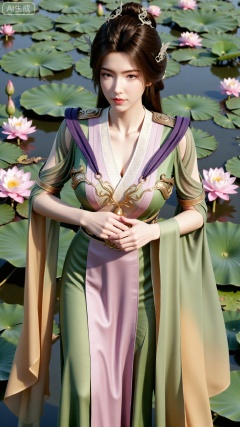 (masterpiece, best quality:1.2),1girl, navel, solo, midriff, bare shoulders, hair ornament,(long hair),(High double ponytail:1.19), red lips, BREAK, (looking at viewer:1.39), chinese clothes,(Holographic Color long dress:1.36), (lace,Rainbow Gradient Color:1.28), BREAK,blurry, solo focus, long hair, lips, daytime, lipstick, outdoors, standing,upper body,(huge breasts:2.89), background, solo, makeup,(Stockings, high heels:1.29),(huge breasts:2.99),(full breasts:2.99),,(Background with lotus pond and pink lotus flowers:1.39),XbaifengsongyuYH,Xbigbreasts,XxinruyinX,XxinruyinXM,XhnayunzhiXYH,XhanyunzhiXY