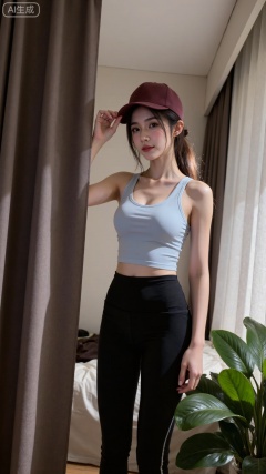 "1girl,girlish feeling,solo,highres,natural body,slim body,beauty body,highlight,swan neck detailed face,{extremely delicate and beautiful},(beautiful detailed face:1.3),(extremely fine and beautiful:1.2),Absolutely beautiful, nice eye,(beautiful eyes:1.2),bright eyes,(eyeliner:0.5),(blush:0.5) (large natural soft breasts,36D), Beautiful legs,tight highs,Legs of even thickness (20D black pantyhose) single line shoulder, collarbone, In the warm and bright bedroom, the sun shines gently through the tulle curtains to create a natural and soft light. A slender young beauty is taking a selfie in front of the mirror with her cell phone in her hand. She wore a simple and fashionable baseball cap, under the brim, a maroon ponytail dangled playfully on one shoulder, swaying slightly as she moved. The beauty has fair skin and shiny. On her delicate melon-shaped face, she has big watery eyes and is lively and vivid, and her thick eyelashes flutter like butterfly wings. Under the bridge of the high nose, his pink lips raised slightly, showing a confident and charming smile. She was wearing a slim yoga suit, with a light blue sports vest on the top, just showing her flat belly and graceful neck lines, highlighting the tight muscle lines; her lower body was paired with black yoga pants, perfectly outlining her slender and straight legs, and there were some white lines on the legs, adding a bit of fashion. The mirror reflects the simple and neat bedroom layout behind her, with a light-colored bed and a few pots of vibrant green plants. The beauty turned her body slightly to adjust the angle, and the ponytail swung gently, and the shadow of the brim changed rhythmically on her face. Her fingers touched the screen on the phone, and her eyes were sometimes focused on the screen and sometimes raised their eyes to look at the mirror, with their eyes flashing lively. As the body moves slightly, the yoga suit also deforms slightly, highlighting the dynamic changes in the body lines, especially the muscle lines of the legs rise and fall with the changes in the standing posture. The surrounding light flowed through her body due to her movements, and the leaves of the green plants behind her were also driven by the slight air flow and swayed slightly.
