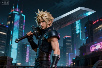这幅图像艺术性地呈现了《最终幻想VII》主角克劳德的经典形象。画面中金色短发的战士侧身而立,肩扛造型夸张的巨型长刀,刀身闪烁的冷光与背景的霓虹都市交相辉映。人物身着黑色战斗服与金属护甲,在夜幕下勾勒出利落剪影,科幻都市中林立的高楼与闪烁灯光构成迷离背景,暗色调天空渲染出神秘氛围。通过冷峻的色彩搭配与充满未来感的场景设计,既展现了角色独特的视觉特征,又传递出游戏世界特有的赛博朋克美学,完美融合了奇幻元素与科技质感。