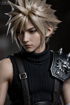 这幅肖像作品以经典的黑白摄影手法,深刻塑造了《最终幻想VII》主角克劳德·斯特莱夫的内在世界。画面聚焦于角色上半身特写,他低垂的眼帘与微侧的面容在柔光中显得沉静而忧郁,金色刺猬头发型的每缕发丝都清晰可辨。黑色高领针织衫的厚重质感与垂坠披风形成层次对比,左肩的金属狼头徽章象征着与挚友扎克斯的羁绊,而披风边缘的方形银扣则成为画面点睛之笔。虚化的背景使观者视线完全凝聚于人物神态与服装细节,单色调处理不仅强化了面料纹理的戏剧性表现,更赋予整个画面一种超越时空的史诗感,完美呈现了这位游戏史上最具悲剧色彩的英雄形象。