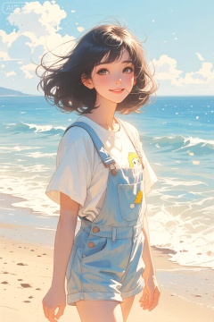 拥有灵动大眼睛与齐刘海的少女,穿着白色短袖搭配浅蓝色背带短裤,青春活力满满。她站在洒满阳光的海边沙滩上,海浪轻轻拍打着岸边,远处是湛蓝的大海与洁白的云朵。以充满童趣的梦幻现代数字插画风格展现。暖黄色的侧光,勾勒出她俏皮的轮廓,同时照亮沙滩与海浪。渲染注重细节,如衣服上的卡通图案、发丝的光泽以及沙滩的颗粒感。色彩以清新的蓝白色调为主,搭配少许明亮的黄色,活泼又亮眼。运用近景构图,着重刻画少女活泼的神态,产出高质量、洋溢少女感的性感写真。