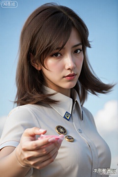 该图像的特色是一个年轻的女人,有着肩膀的棕色头发,饰有侧面部分,还有几束头发轻轻落在她的额头上。她的头发被风略带打击,给现场带来了动态的感觉。她的肤色清晰,穿着化妆,可以巧妙地增强她的功能。她的眼睛睁大而专注,脸上表现出平静而坚定的表情。她穿着浅色的,可能是白色的均匀衬衫,带有高领。在衣领的左侧,有一个小的蓝色和黄色标志,在她胸部的右侧,有两个圆形徽章- 一个带有星爆的设计,另一个带有不同的标志。她的右手握着一个小的粉红色物体,张开,好像在提供或展示它一样。背景是晴朗的蓝天,上面有一些散落的蓬松的白云,暗示着明亮的晴天。在左上角,有一个带有汉字的小标签,在右下角,有一个较大的文字,中文字符和一些风格化的元素。图像的整体组成是干净和专注的,女人是中心主题。