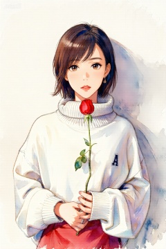The image depicts a young woman with short, dark brown hair, wearing a white turtleneck sweater with a small letter "A" on the left side of her chest. She is holding a single red rose in her hands, which are gently clasped together in front of her. The background is a soft watercolor wash, giving a gentle and dreamy effect to the scene. The overall atmosphere is serene and slightly nostalgic, with the watercolor style adding a touch of elegance and warmth.