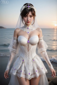 该图像以一个穿着精致的幻想风格的服装打扮的人。该人穿着白色,形状合身的紧身胸衣,上面有复杂的蕾丝细节和甜心领口,中央装饰有一个紫色的宝石。袖子很长,由透明的蕾丝织物制成,裙子也是蕾丝,装饰有花卉图案和小的紫色宝石。该人的头发在updo中造型,他们戴着包括白花和紫色宝石的头饰,与服装的整体美感相匹配。头饰从头饰延伸,增添了空灵的外观。年轻细腻白皙的皮肤,看着镜头,海边,夕阳,从头到膝盖的照片,,徐欣
