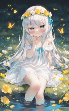 masterpiece,absurdres,best quality,high quality,chromatic_aberration,night,darkness,black theme,photorealistic,high contrast,high saturation,loli,loli,loli,//,1girl,bug,butterfly,solo,long hair,blue eyes,head wreath,smile,white hair,dress,looking at viewer,flower wreath,ribbon,water,sitting,flower,outdoors,grass,blue ribbon,white dress,hair ribbon,blush,off shoulder,day,closed mouth,on grass,yellow flower,off-shoulder dress,bare shoulders,virtual youtuber,petals,white flower,very long hair,yellow butterfly,collarbone,soaking feet,sundress,arm support,grey hair,spaghetti strap,hand up,white butterfly,<lora:Nai4 gzc:1>,