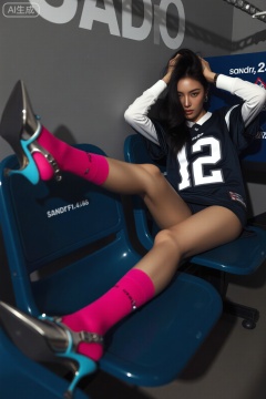 主体是一位长发女性,身着深蓝色带白色数字“12” 的运动球衣,内搭白色长袖,下搭短裤,脚穿亮粉色长袜与银蓝拼色尖头皮质高跟鞋;她姿态慵懒又充满张力,一手抓着头发,腿部交叉伸展。环境为灰调的室内休息区,有深蓝色座椅与带文字的背景墙,营造出运动风与时尚感交融的空间。光线采用侧逆柔光,勾勒出人物轮廓与衣物质感,让亮粉色袜子成为视觉焦点。色彩上以灰蓝的冷调为基底,碰撞亮粉的热烈,形成强烈视觉反差。构图采用斜线构图,利用腿部延伸与手臂线条引导视线,增强画面动感。拍摄角度为稍低的平视角度,凸显人物气场。滤镜选用“时尚锐化+ 复古灰蓝调”,保留色彩层次同时增添杂志质感。摄影参数:使用索尼Alpha 1 相机,搭配FE 85mm F1.4 GM 镜头,快门速度1/125s,光圈f/2.8,焦段85mm,ISO 100。后期强化色彩对比度,提升袜子与鞋子的锐度,增加整体画面的颗粒感与时尚杂志的印刷质感。