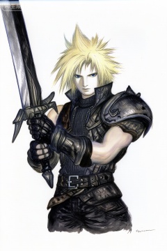 这幅插画精准地捕捉了《最终幻想7》中主角克劳德·斯特莱夫的标志性形象。他标志性的金黄色刺猬头、坚毅的眼神,以及极具辨识度的融合了护甲与皮带的黑色服装都得到了细致刻画。画面的核心焦点是他手中紧握的巨剑,充分展现了其作为前神罗战士的力量感。纯白的背景使角色主体格外突出,而克劳德蓝色的眼眸则为整体冷峻的色调增添了一抹生动的色彩,完美凸显了其英勇无畏的经典战士姿态。