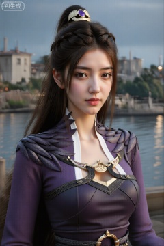 该图像描绘了一个年轻的女人,长长的黑发在高高的马尾辫上造型,并用装饰性的发型固定,上面有一个大紫色宝石,周围环绕着金色的细节。她的头发在马尾辫的底部整齐地编织。她的肤色合理,并且穿着化妆,突显了她的眼睛和嘴唇。 她穿着合身,紫色的衣服,带有复杂的设计元素。服装的顶部有一个高领带有白色饰边的高领,并具有从肩膀延伸的织物或材料制成的精美的翼状结构。服装的胸部区域装饰有金色和黑色装饰品,包括圆形的奖章和棱角分明的几何设计。这件衣服还在领口和腰围周围有黑色和金色的饰边,并带有带有金扣的皮带。 背景显示了黄昏或傍晚时期的海滨场景,远处可见建筑物和树木,天空部分多云,有柔软的自然光线。整体环境似乎在户外,可能在河流或运河附近。