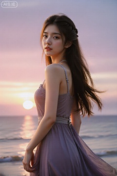 一位长发飘飘的活力女孩,在日落时分的海边。她穿着飘逸的吊带长裙,。她回头望向镜头,夕阳的余晖为她勾勒出金色的轮廓,。背景是粉紫色渐变的天空,整个画面充满电影感和治愈感。