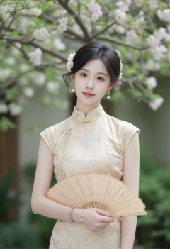 fine detail,hanfu,big breasts,hdr,cheongsam,cheongsam,This photo captures a young woman standing in a courtyard in Jiangnan. The lady has fair skin and her dark hair is styled into a sleek chignon with a few loose strands framing her face and adorned with delicate and luxurious hair accessories,including small flowers and pearl-like beads. She is wearing a traditional Chinese cheongsam,a high-necked sleeveless dress made of luxurious silk fabric,featuring intricate embroidery in gold,peach,and pale pink colors. The embroidery depicts floral and leaf patterns,adding a touch of elegance and refinement to the attire. The lady holds a folding fan in her right hand,and she wears a pair of dangling gold earrings and a simple silver bracelet on her left wrist. Her makeup is delicate and charming,enhancing her exquisite features with natural luster. The background includes a hint of green foliage and a blurred,out-of-focus tree full of flowers,suggesting a serene and possibly spring-like environment. The overall ambiance of the image is one of elegance,tradition,and refined beauty.,