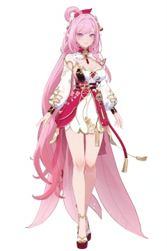 8k,best quality,masterpiece,(ultra-detailed),(high detailed skin),(by nanoless, by misumi \(macaroni\),:0.5),A full-body portrait of a young girl,standing gracefully,pastel art style,high-key lighting,shoujo manga influence,hd quality,delicate details,full body,full shot,standing,looking at viewer,(solo:1.2),simple background,(white background:1.2),<lora:Elysia-sd-Tanger-000019:0.8>,elysia \(honkai impact\),Elysiacn,clothes: Elysiacn red-and-pink chinese dress,Elysiacn hair ornament,1girl,pink hair,pointy ears,breasts,long hair,elf,purple eyes,flower,bangs,hair flower,diamond-shaped pupils,Peach branch with peach blossom,asymmetrical dress,