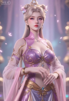 A mesmerizing fantasy princess with ethereal beauty stands elegantly, her long, platinum blonde hair styled into delicate twin tails adorned with translucent butterfly-like ornaments and shimmering golden accessories. Her large, enchanting blue eyes and porcelain skin radiate an otherworldly charm, enhanced by soft pink lips and a subtle flush on her cheeks. She wears an opulent gown in pastel pink, intricately decorated with golden embroidery, sparkling gemstones, and flowing sheer fabric that cascades gracefully over her shoulders. A delicate silver necklace with a star-shaped pendant rests against her collarbone, adding to her celestial allure.The backdrop features a dreamy, gradient-lit studio with hues of soft lavender, pastel pink, and icy blue blending seamlessly, creating an enchanting atmosphere. The diffused lighting casts a gentle glow, illuminating the shimmering details of her gown while producing a soft bokeh effect in the background. Floating iridescent particles add a touch of magic, making the scene feel surreal and fairy-tale-like.Camera: Canon EOS R5 + RF 85mm f/1.2L | Soft, diffused studio lighting with pastel hues, creating a luminous, dreamlike effect. The composition is balanced, focusing on the intricate details of the gown and accessories, while maintaining an ethereal and regal atmosphere. The overall mood is magical, elegant, and enchanting.,Rebecca Chambers from Resident Evil , Resident Evil setting, Flat breasts, very small ass, orange-brown hair,,