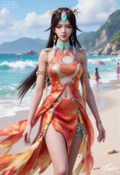 1girl,solo,standing,looking at viewer,(cowboy_shot:1.3),black hair,long hair,high heels,blurry background,depth of field,motion blur,short dress,china_dress,chinese_style,bare shouders,crystal_earrings,headpiece,hair_tie,chest_jewel,gem,necklace,jewelry,in summer,day,outdoors,nature,sea,(rose,beach:1.4),(huge breasts:2.99),(full breasts:1.99)
