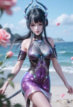 1girl,solo,standing,looking at viewer,(cowboy_shot:1.3),black hair,long hair,high heels,blurry background,depth of field,motion blur,short dress,china_dress,chinese_style,bare shouders,crystal_earrings,headpiece,hair_tie,chest_jewel,gem,necklace,jewelry,in summer,day,outdoors,nature,sea,(rose,beach:1.4),(huge breasts:2.99),(full breasts:1.99)
