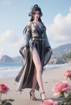 1girl,solo,standing,looking at viewer,(cowboy_shot:1.3),black hair,long hair,high heels,blurry background,depth of field,motion blur,short dress,china_dress,chinese_style,bare shouders,crystal_earrings,headpiece,hair_tie,chest_jewel,gem,necklace,jewelry,in summer,day,outdoors,nature,sea,(rose,beach:1.4),(huge breasts:2.99),(full breasts:1.99)