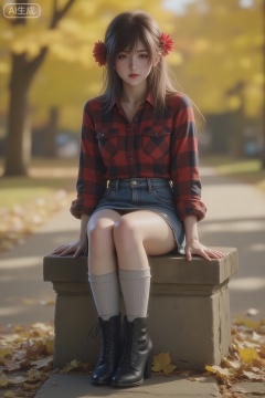 A photorealistic portrait of a young Asian woman with long, wavy brown hair adorned with red floral hair accessories. She is wearing a red and black plaid shirt, a short denim skirt, light gray ribbed knee-high socks, and black lace-up high-heeled ankle boots. She is sitting on a weathered stone ledge in an autumnal park, with fallen leaves scattered around. The background features a blurred path lined with trees with golden-yellow autumn foliage, bathed in soft, warm sunlight. The composition has a shallow depth of field, emphasizing the subject while creating a dreamy bokeh effect. The overall mood is serene and nostalgic, with rich details in the clothing, natural elements, and realistic lighting that highlights the textures of the skin, fabric, and environment.