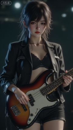Stage lights shine on the character, with a blurred black stage background, which is concise and grand, making the character and the instrument the visual focus, presenting a cool and tense rock stage atmosphere.