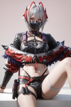masterpiece,best quality,realistic,cinematic,detail eyes,(ultra-detailed),perfect composition,intricate details,absurdres,detailed face,high quality,high res,8K,1girl,breast,medium breast,hair_ornament,red eyes,grey hair,multicolored_hair,<lora:X_weishidaier_IL3.0:0.8>,thigh strap,horns,mask,short hair,jacket,shorts,black shorts,shirt,midriff,off shoulder,black jacket,mouth mask,underwear,buckle,antenna hair,short shorts,panties,black shirt,crop top,highleg,white hair,open jacket,red hair,antennae,belt buckle,open clothes,alternate costume,red horns,long sleeves,cropped jacket,black mask,thigh pouch,highleg panties,breasts,thighs,hair between eyes,simple background,sitting,