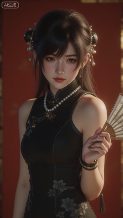 A woman in a realistic CG style, with jet - black long hair tied into an exquisite bun. The hair is smooth and has a natural luster, and a few broken hairs show more delicate texture under the side light. She is wearing a black cheongsam with dark floral patterns made of velvet fabric. The velvet fabric has a true texture, and under the warm light, the surface glows with a soft matte velvet luster. The dark floral patterns have clear textures, forming a delicate textural contrast with the velvet base fabric. She holds a folding fan with white floral patterns — the fan surface paper has a thin texture, the pattern printing is fine, and the wood texture and luster of the fan bones are truly distinguishable, with the black tassel hanging naturally. A pearl necklace is worn around her neck, and each pearl is round and full, reflecting a soft pearly luster on the surface. The jade bracelet on her wrist has a warm and moist color, and under the light, it reveals the unique transparency and subtle texture of jade. She leans against a vermilion gate with golden door nails: the surface of the golden door nails is smooth, reflecting a bright and layered metallic luster, and the lacquer of the vermilion wooden door is delicate, showing a warm light - dark transition under the light. The overall light is soft side - backlight, creating rich light - shadow layers on the hair, cheongsam, folding fan, jewelry, and door nails. The textures of various materials (velvet, paper, wood, pearl, jade, metal, lacquer) are accurately restored, fully demonstrating the delicacy and realism of realistic CG.