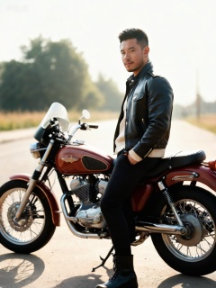 质量词: masterpiece, best quality, highres, ultra-detailed, absurdres 画面风格: realistic, cinematic lighting, vintage atmosphere, sharp focus 人物特征: 1man, solo, 30s, neat short hair, rugged masculinity, confident expression, relaxed posture 人物服饰: well-fitted leather jacket, (fitted to the body:1.1), dark pants, boots 人物事件: leaning against a vintage motorcycle, one hand resting on the bike, outdoor setting, soft shadow, sunlight casting warm tone, background slightly blurred to highlight the subject,DYMAN