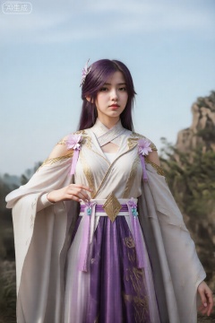 图像描绘了一个人,有一头紫色的长直发,头上戴着一个花朵图案的发夹。该人穿着精致的传统风格服装,融合了奇幻元素和中国历史服饰的元素。主要服装是一件飘逸的灰白色长袖长袍,边缘和肩部饰有复杂的金色刺绣。长袍采用高领设计,精致的图案设计,肩部附近饰有紫色和粉红色的花卉装饰,中央有紫色织物的垂直条纹。腰间系着一条系成蝴蝶结的宽紫色腰带,流苏垂落。下半身是一条深紫色的裙子,上面有金色的图案,增添了一种王者气息。背景展示了晴朗天空下的岩石山地景观和一些绿色植物,暗示着户外环境。整体外观优雅超凡,注重细节的服装设计和宁静的自然背景。