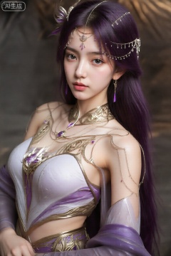 这张照片上的人物有一头长长的、充满活力的紫色头发,配有复杂的金色和银色发饰,其中包括精致的链子和小型宝石状装饰。该人穿着精致的服装,融合了幻想和未来主义设计元素。该服装由合身的半透明上衣组成,其底色为白色,带有华丽的金色图案,并点缀着紫色宝石。该设计包括锐利、棱角分明的线条和透明面料的混合,露出下面的皮肤。该人还穿着一件飘逸的紫色斗篷或带有类似金色细节的外衣。。整体外观高度风格化和超凡脱俗,注重复杂的细节和引人注目的调色板。
