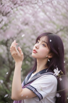 ,精致壁纸风摄影,春日樱花盛开的季节,一位穿着JK制服的学妹站在漫天飞舞的樱花雨中。她微微仰头,伸手去接飘落的花瓣,眼神中带着憧憬和美好。画面柔和浪漫,以粉白色调为主,背景是虚化的樱花树林,前景有花瓣飘过,层次感丰富。